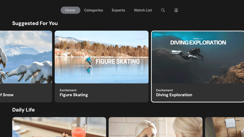 People with dementia often feel overwhelmed by fast-paced or complex visuals. That’s why Menta’s content is developed in collaboration with dementia experts, neurologists, and psychologists, using calm movement, natural sound, and balanced colors.